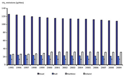 | Como é do conhecimento público, o volume das emissões de CO2 por unidade transportada tonelada-quilómetro pelos diversos modos de transporte encontra no transporte rodoviário a sua principal fonte a nível europeu, o que é mais grave quando a nível do transporte intra-comunitário este modo de transporte representa 46% de todas as toneladas-quilómetro efectuadas no transporte de cargas de todos os modos, com o mar a representar 37%. Existindo hoje em dia uma grande preocupação com todas as questões ambientais e com a sustentabilidade dos transportes, o Livro Branco da Comissão europeia recentemente divulgado aponta para metas muito ambiciosas de redução do peso da rodovia nos transportes além dos 300 km de distância. Foi anunciada a redução até 2030 de 30%, e até 2050 de 50%, do tráfego rodoviário além de 300 km, com transferência para o modo marítimo, fluvial e ferroviário, reservando para a rodovia o papel apenas nas pontas finais do transporte. |