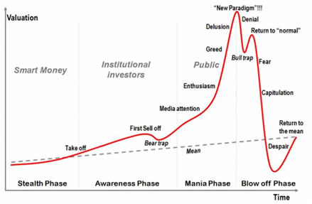 | Por outro lado, com a redução das importações portuguesas e as políticas de saída da crise que apontam para a necessidade urgente de se fomentar as exportações portuguesas, também para a Europa, - neste caso designado comércio com os parceiros europeus -, a rodovia tem vindo em 2011 a ter dificuldade em equilibrar os tráfegos de entrada e saída e ser competitiva em certos destinos europeus, o que não facilita a vida aos nossos exportadores. Então que alternativas podem ser criadas? Sabemos ainda que existirão nos próximos anos fortes restrições ao investimento público, o que certamente não vai deixar de afectar o desenvolvimento da ferrovia na sua ligação à Europa em bitola europeia e a expansão dos portos. Apesar da euforia ou negação ainda existente, não deixaremos de ter que restringir fortemente a bolha de investimento público dos últimos anos. Estamos na fase de “return to normal” do ciclo das bolhas económicas de Rodrigue. |